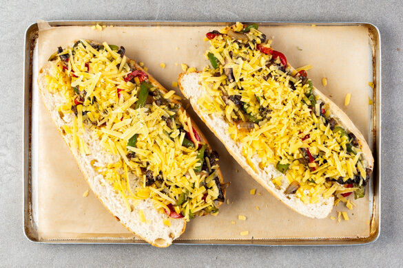 Die Baguettebrötchen ein-, aber nicht ganz durchschneiden und mit der Pilz-Paprika-Füllung belegen. Den Käse auf der Füllung verteilen und die Sandwiches im Ofen 4–5Min. backen, bis der Käse geschmolzen ist.