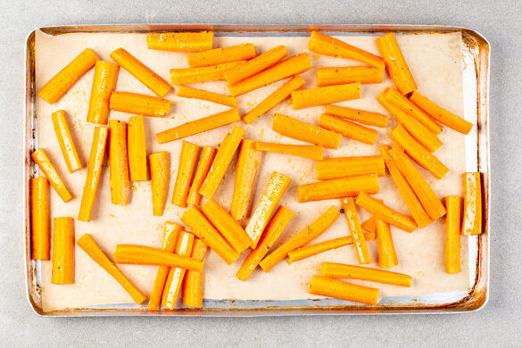 Den Backofen auf 240°C (220°C Umluft) vorheizen. Die Karotten ggf. schälen, je nach Dicke längs vierteln oder sechsteln und dann quer halbieren. Auf einem mit Backpapier ausgelegten Backblech mit 2EL Olivenöl und 1 kräftigen Prise Salz vermengen und im Ofen 20–25Min. rösten. Nach der Hälfte der Zeit wenden.