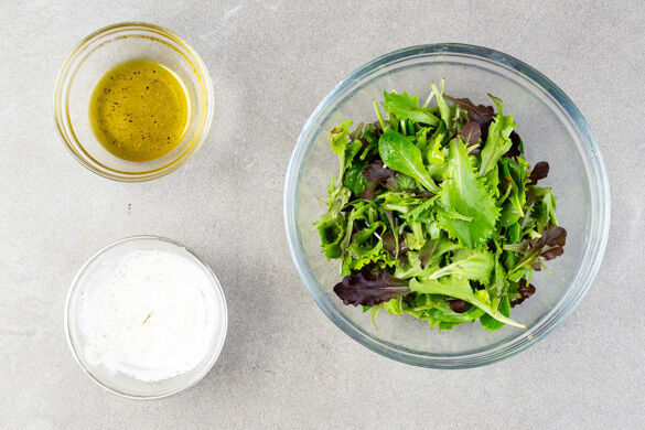 2EL Mayonnaise mit 1EL Wasser und 1 Prise Oregano zu einem Dip verrühren, mit Salz abschmecken. 2EL Olivenöl, 1–2EL Essig und je 1 Prise Salz, Pfeffer und Zucker verrühren und mit dem Salat vermengen. Die Portobello-Sandwiches mit den Karottenpommes und dem Dip anrichten und den Salat dazu servieren.