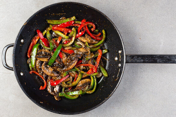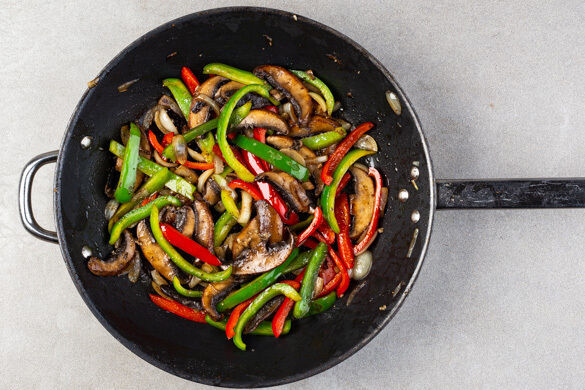 Die Pilze in einer großen Pfanne oder Grillpfanne mit 1EL Olivenöl bei starker Hitze unter häufigem Rühren ca. 4Min. braten, bis sie Flüssigkeit abgeben. Die Zwiebeln, den Knoblauch und die Paprika zugeben und 4–5Min. anbräunen. Mit Salz und Pfeffer abschmecken.
