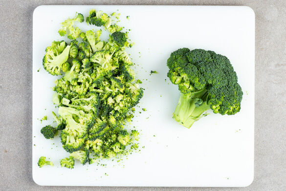 Den Backofen auf 240°C (220°C Umluft) vorheizen. Die unteren 2–3cm des Brokkolistrunks entfernen, dann den Brokkoli längs halbieren, mit der Schnittseite nach unten auf ein Brett legen und in ca. 0,5cm dünne Scheiben schneiden. Dabei wird ein Großteil der Brokkoliröschen, wie gewollt, auseinanderfallen.
