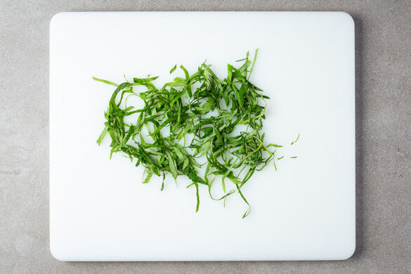 Die Basilikumblätter von den Stängeln zupfen und in dünne Streifen schneiden.