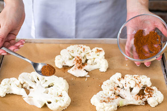 Die Blumenkohlsteaks auf ein mit Backpapier ausgelegtes Backblech legen, mit 1–2EL Olivenöl bepinseln und die 1/2 der Gewürzmischung sowie je 1 Prise Salz und Pfeffer darüberstreuen. 20–25Min. im Ofen backen, bis die Blumenkohlsteaks leicht gebräunt und am unteren Ende weich sind, wenn man mit einem Messer hineinsticht.