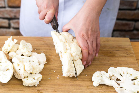 Den Backofen auf 200°C (180°C Umluft) vorheizen. Die Blätter vom Blumenkohl entfernen und den Strunk so abschneiden, dass der Kohl auf dem Brett stehen kann. Aus der Mitte des Blumenkohls 4 1–2cm dicke „Steaks“ schneiden, den übrigen Kohl für das Püree grob schneiden. Die Zitronenschale abreiben, dann die Zitrone halbieren und auspressen.