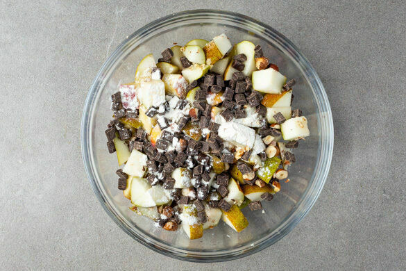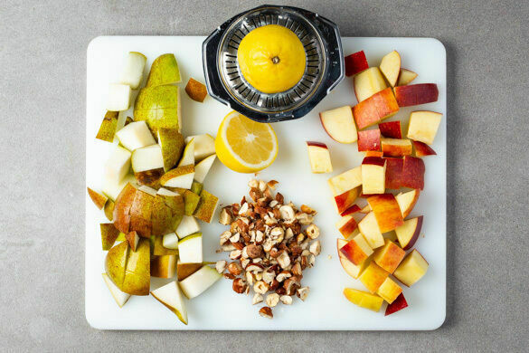 Den Backofen auf 220°C (200°C Umluft) vorheizen. Die Äpfel und die Birnen vierteln, entkernen und in ca. 2cm große Würfel schneiden. Die Haselnüsse grob hacken. Die Zitrone auspressen.