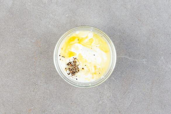 Mit einem Löffel vorsichtig 2 Zitronenspalten aus dem Ofen holen und etwas abkühlen lassen. Den Knoblauch schälen und fein reiben oder sehr fein würfeln. Die 2 Zitronenspalten auspressen und den warmen Zitronensaft mit dem Joghurt, dem Knoblauch und 1–2EL Olivenöl verrühren, den Dip mit Salz und Pfeffer abschmecken.