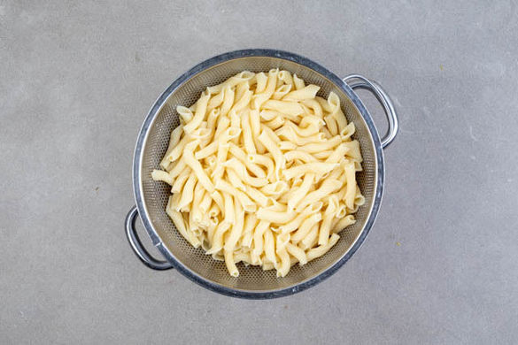 Die Pasta in das kochende Wasser geben und in 6–8Min. bissfest kochen. In ein Sieb abgießen und abtropfen lassen.