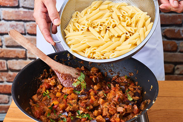 Zusammen mit den Hiller Brüdern von Kitchen Stories haben wir wir ein köstliches Pasta-Gericht für dich vorbereitet: Wir schwenken herzhafte Penne in einer feinen Tomatensauce, die wir mit Aubergine und Thymian verfeinern. Dazu gibt es einen Klecks Ricotta und ein paar frische Basilikumblätter. Da sind auch die Kleinsten hellauf begeistert!