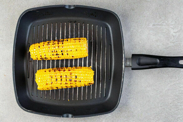 Eine Grillpfanne ohne Zugabe von Fett hoch erhitzen. Die Maiskolben in die heiße Pfanne legen, mit je 1 Prise Salz und Pfeffer würzen und ca. 5Min. grillen, bis der Mais stellenweise gebräunt ist, gelegentlich wenden. Die Maiskolben aus der Pfanne nehmen, auf einem Teller etwas abkühlen lassen, dann den Mais mit einem scharfen Messer vom Kolben schneiden. Die Pfanne aufbewahren.