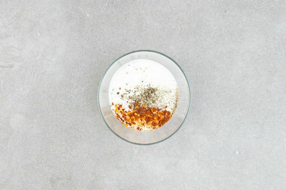 Den Backofen auf 240°C (220°C Umluft) vorheizen. In einem kleinen Topf 500ml leicht gesalzenes Wasser für den Bulgur zum Kochen bringen. Den Joghurt mit 1/4 der Harissa-Gewürzmischung oder mehr nach Geschmack, 1 kräftigen Prise Salz und 1 Prise Pfeffer glatt rühren und kühl stellen.