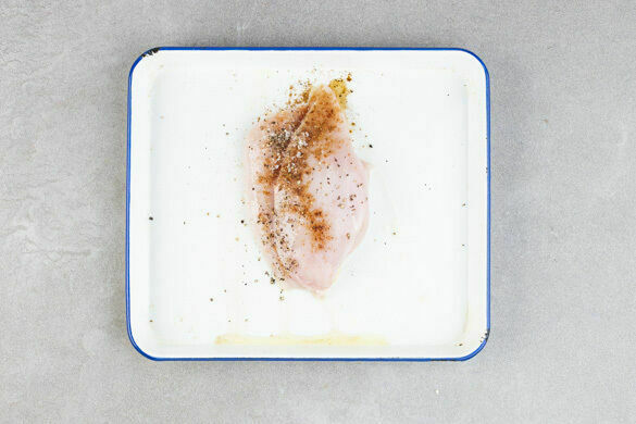 Das Fleisch trocken tupfen, mit 2EL Olivenöl, der 1/2 des Ras el-Hanout und je 1 kräftigen Prise Salz und Pfeffer einreiben und in eine Auflaufform legen.