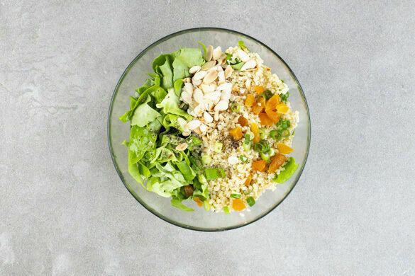 Den Salat vom Strunk befreien und in mundgerechte Stücke schneiden. Die Lauchzwiebeln in dünne Ringe schneiden. Die Mandeln grob hacken. Den Bulgur mit einer Gabel auflockern und mit den Mandeln, dem Salat, der 1/2 der Lauchzwiebeln, 2EL Olivenöl, 2EL Essig (bevorzugt Weiß- oder Rotweinessig) und je 1 kräftigen Prise Salz und Pfeffer vermengen.