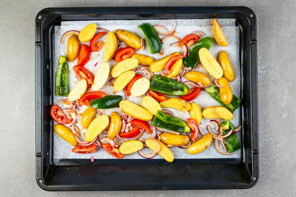 Die Kartoffeln samt Schale halbieren. Die Paprika vierteln, entkernen und in 2–3cm breite Streifen schneiden. Die Tomaten in Spalten schneiden. Die Zwiebel schälen, halbieren und in feine Streifen schneiden. Das Gemüse auf zwei mit Backpapier ausgelegten Backblechen mit 3EL Olivenöl sowie je 1 kräftigen Prise Salz und Pfeffer vermengen.