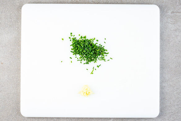 Den Backofen auf 220°C (200°C Umluft) vorheizen. Den Schnittknoblauch in feine Röllchen schneiden. Den Knoblauch schälen und durch eine Knoblauchpresse drücken oder fein reiben.