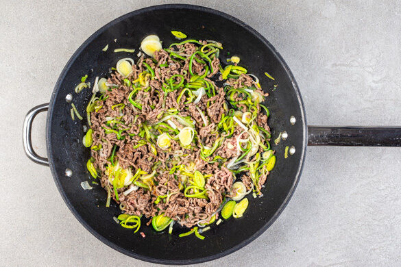Das Hackfleisch und den Lauch in einer mittelgroßen Pfanne mit 1EL Olivenöl 3–4Min. braten, bis das Hackfleisch appetitlich gebräunt ist. Mit je 1 kräftigen Prise Salz und Pfeffer würzen und die Pfanne vom Herd nehmen.