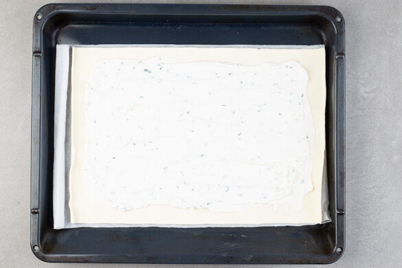 Den Teig mit dem Papier nach unten auf einem Backblech ausrollen und gleichmäßig mit dem Ricotta bestreichen, dabei einen Rand von ca. 1cm aussparen.