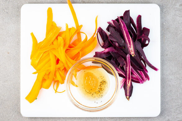 Die Karotten ggf. schälen, mit einem Sparschäler rundherum in dünne Streifen schneiden und mit 1–2EL Olivenöl, 1EL Essig, 1 kräftigen Prise Zucker und je 1 Prise Salz und Pfeffer vermengen. Die fertige Tarte mit dem restlichen Schnittknoblauch bestreuen und mit dem Karottensalat servieren.