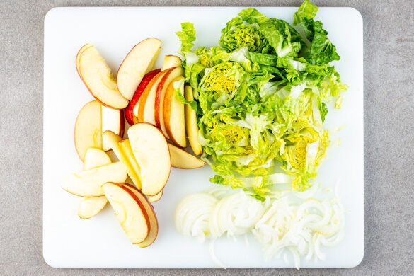 Inzwischen den Apfel vierteln, entkernen und in ca. 1cm dünne Spalten schneiden. Die Zwiebel schälen, halbieren und in feine Streifen schneiden. Den Salat ebenfalls in feine Streifen schneiden, den Strunk entfernen.