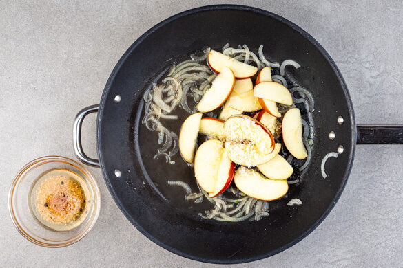 In derselben Pfanne 2EL Wasser mittelhoch erhitzen und die Zwiebeln darin 1–2Min. glasig dünsten. Die Apfelspalten und je nach Geschmack 1–2TL geriebenen Meerrettich hinzugeben und 2–3Min. mitbraten. 2EL Olivenöl, 1EL Essig, den übrigen Meerrettich nach Geschmack und je 1 Prise Salz und Pfeffer zu einem Dressing verrühren und kurz vor dem Servieren unter den Salat mengen.
