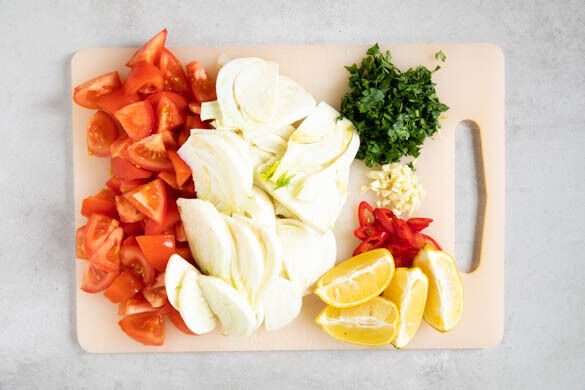 Die Tomaten grob würfeln, dabei den Strunk entfernen. Den Fenchel längs halbieren und in dünne Scheiben schneiden, das Fenchelgrün für die Garnitur beiseitelegen. Die Petersilie samt Stängeln fein hacken. Die Zitrone in Spalten schneiden. Den Knoblauch schälen und grob würfeln. Die Peperoni in feine Ringe schneiden. Tipp: Für weniger Schärfe die Kerne entfernen.