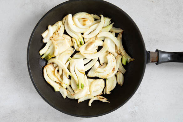 Den Fenchel in einer großen Pfanne mit 1EL Olivenöl bei mittlerer Hitze 5–7Min. anbraten, bis er etwas weicher und leicht gebräunt ist.