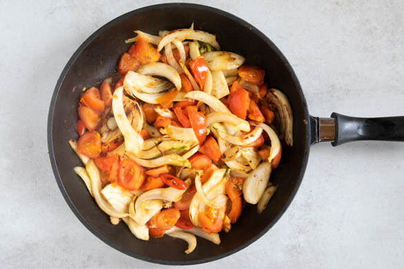 Den Knoblauch und die 1/2 der Peperoni oder mehr nach Geschmack dazugeben und ca. 1Min. mitbraten. Die Tomaten zufügen und alles unter gelegentlichem Rühren weitere ca. 2Min. braten. Mit der 1/2 der Brühe ablöschen und die Sauce ca. 3Min. köcheln lassen, mit Salz und Pfeffer abschmecken. Die Makrele von Haut und ggf. Gräten befreien und in mundgerechte Stücke zupfen.