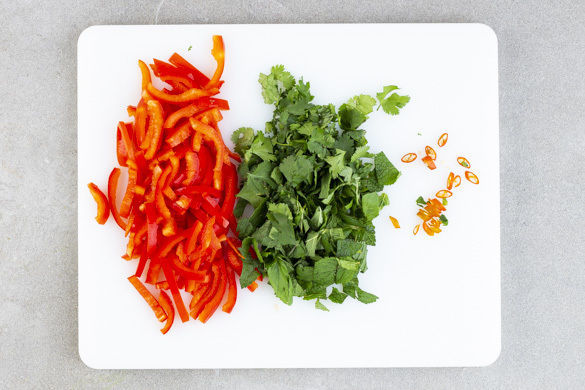 Die Paprika vierteln, entkernen und in dünne Streifen schneiden. Die Paprikastreifen noch einmal quer halbieren. Die Minze- und die Thai-Basilikumblätter abzupfen und grob schneiden. Den Koriander samt Stängeln grob schneiden. Die Chilischote in feine Ringe schneiden. In einem Wasserkocher ausreichend Wasser für die Nudeln zum Kochen bringen.