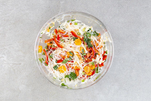 Die Nudeln mit 1 Prise Salz in eine Schüssel geben und mit dem kochenden Wasser übergießen. 3–5Min. ziehen lassen, dann in ein Sieb abgießen und mit kaltem Wasser abspülen.
