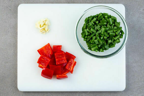In einem großen Topf ausreichend gesalzenes Wasser für die Pasta zum Kochen bringen. Die Bohnen schräg in ca. 1cm lange Stücke schneiden, die Enden entfernen. Die Paprika vierteln, entkernen und in 2–3cm große Stücke schneiden. Den Knoblauch schälen und grob würfeln.