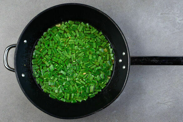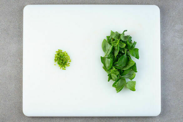 Die Basilikumblätter abzupfen und grob zerteilen, die Stängel fein schneiden.