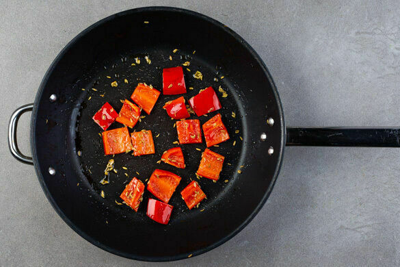 Die Paprika in einer zweiten großen Pfanne mit 2EL Olivenöl und 2 Prisen Salz bei mittlerer Hitze ca. 6Min. braten, bis sie weich ist. Die Fenchelsamen dazugeben und ca. 2Min. mitbraten, dann die Pfanne vom Herd nehmen und beiseitestellen.