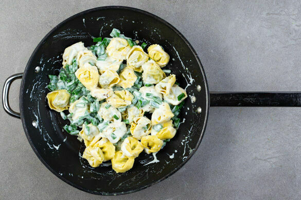 Tortellini oder Tortelloni? Worin liegt eigentlich der Unterschied? Tortelloni zeichnen sich traditionell nicht nur durch die vegetarische Füllung aus, sondern sind auch etwas größer als ihre kleineren, oft fleischgefüllten Teigtaschen-Vettern. Zum Glück! So gibt’s nämlich für jeden eine ordentliche Portion, die sich inmitten von Bohnen und Feta, mit Fenchel angemachter Paprika und frischer Joghurtsauce äußerst gut macht!