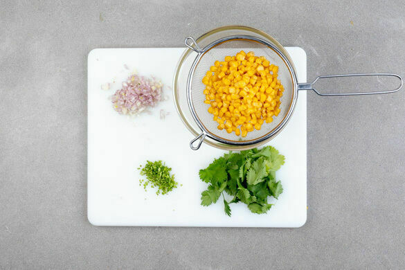 Den Mais in ein Sieb abgießen und abtropfen lassen. Die Zwiebel schälen und fein würfeln. Die Korianderblätter abzupfen und beiseitelegen, die Stängel sehr fein schneiden.