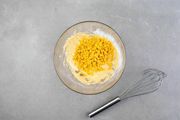 Die Eier mit 1/2TL Paprikapulver, dem Backpulver, 2 Prisen Salz und 1 kräftigen Prise Pfeffer verquirlen. Mit 6–7EL Mehl und den Korianderstängeln zu einem glatten Teig verrühren, zuletzt den Mais untermengen.