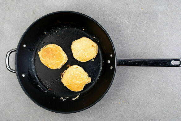 In einer großen Pfanne 1–2EL Pflanzenöl mittelhoch erhitzen. Den Teig portionsweise zu ca. 1,5cm dicken Küchlein ausbacken. Dafür die Küchlein auf jeder Seite 2–3Min. goldbraun braten. Anschließend auf Küchenkrepp abtropfen lassen. Tipp: Wenn es schneller gehen soll, einfach eine zweite Pfanne verwenden.