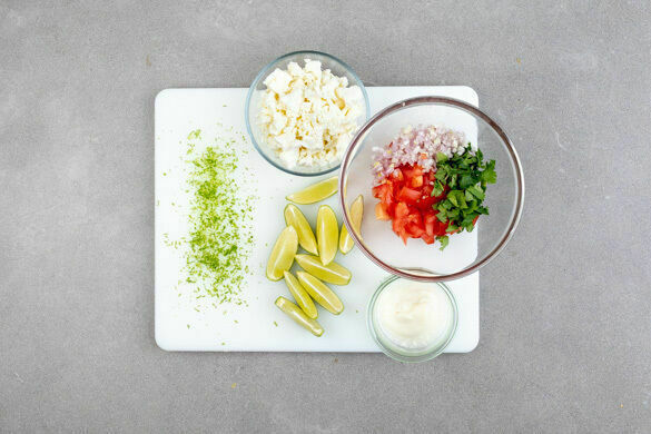Die Limettenschale abreiben und die Limette in Spalten schneiden. Den Feta mit den Fingern oder einer Gabel grob zerkrümeln. Die Korianderblätter grob schneiden. Die Tomaten fein würfeln und mit dem Koriander und den Zwiebelwürfeln vermengen. 4EL Mayonnaise mit 1EL Wasser verrühren.
