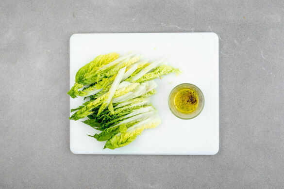 Den Salat nach Geschmack längs oder quer in Streifen schneiden. 2EL Olivenöl, 2–3EL Essig, 1TL Limettenschale und je 1/2TL Salz und Pfeffer zu einem Dressing verrühren und kurz vor dem Servieren mit dem Salat vermengen.