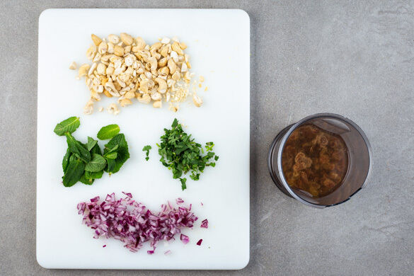 Die Rosinen in einer kleinen Schüssel in etwas heißem Wasser einweichen und beiseitestellen. Die Cashewkerne grob hacken. Die Minzeblätter von den Stängeln zupfen. Den Koriander samt Stängeln grob schneiden. Die Zwiebel schälen, halbieren und fein würfeln.