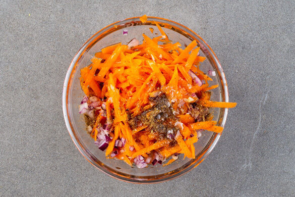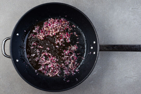 Die 1/2 der Zwiebelwürfel in einer großen Pfanne mit 1TL Olivenöl und 1 Prise Salz bei mittlerer Hitze ca. 3Min. anbraten. 1TL Zucker und 2EL Essig dazugeben und die Pfanne vom Herd nehmen, sobald sich der Zucker aufgelöst hat.