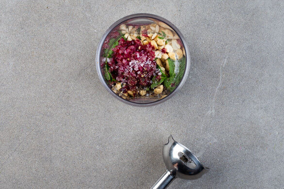 Die angebratenen Zwiebelwürfel, die Minzeblätter, den Koriander samt Stängeln, die Cashewkerne und 1 Prise Pfeffer in einem hohen Gefäß mit einem Stabmixer zu einem möglichst cremigen Chutney pürieren, ggf. mit mehr Salz und Pfeffer würzen. Die Pfanne auswischen und aufbewahren.