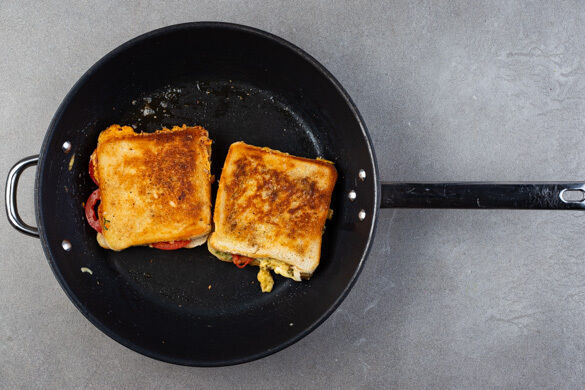 Die Käsetoasts in der Pfanne bei mittlerer Hitze auf jeder Seite 2–3Min. braten, bis der Käse geschmolzen und das Toastbrot goldbraun ist.