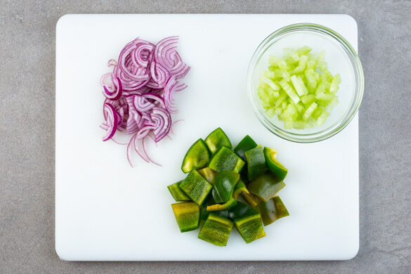 In einem großen Topf die Zwiebeln, die Paprika und den Sellerie mit 2EL Pflanzenöl bei mittlerer bis starker Hitze 1–2Min. anbraten. Mit 1–2TL Mehl bestäuben und mit je 1 Prise Salz, Pfeffer und Gewürzmischung würzen. Die Sojasauce, das Tomatenmark, 300ml Wasser und die 1/2 des Brühgewürzes einrühren und alles abgedeckt bei mittlerer Hitze 5–6Min. köcheln lassen.