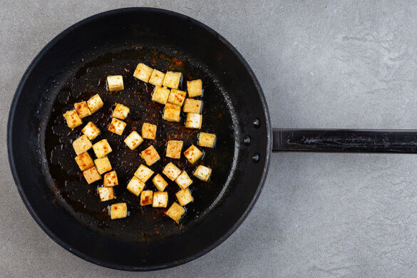 Die Tofuwürfel in einer mittelgroßen Pfanne mit 2EL Pflanzenöl bei mittlerer bis starker Hitze 5–8Min. rundum knusprig anbraten. Nach Geschmack mit dem geräucherten Paprikapulver würzen.