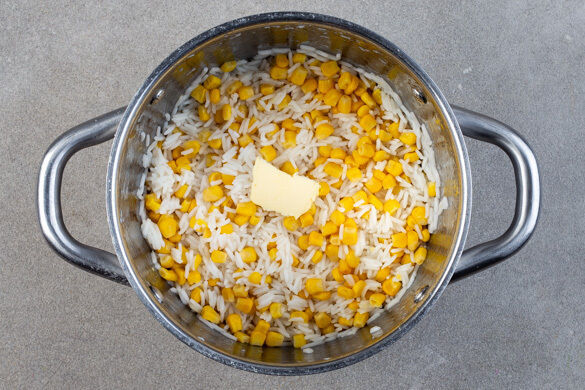 Inzwischen den Reis und die 1/2 des Maises in einem Sieb kalt abspülen, bis das Wasser klar bleibt. Der übrige Mais wird für dieses Rezept nicht benötigt. Den Reis und den Mais in das kochende Wasser geben und abgedeckt bei niedrigster Hitze 10–12Min. kochen, bis das Wasser aufgesogen und der Reis gar ist. Noch ca. 5Min. ohne Hitzezufuhr ziehen lassen.