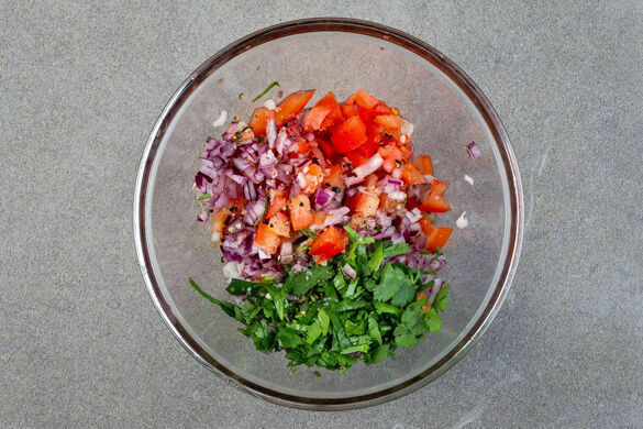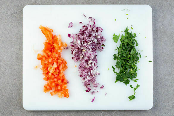 Die Tomaten in kleine Würfel schneiden, dabei den Strunk entfernen. Die Zwiebel schälen, halbieren und fein würfeln. Den Koriander samt Stängeln fein schneiden.