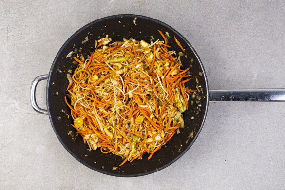 In einer großen Pfanne 2EL Pflanzenöl stark erhitzen. Den Knoblauch und den Ingwer hineingeben, mit 1–2TL Mehl bestäuben und 1Min. anbraten. Den Gemüsemix und 1 kräftige Prise Salz zugeben und bei mittlerer Hitze 2–3Min. braten. Das Ketjap Manis und die 1/2 der Sojasauce unterrühren und alles weitere 3–4Min. braten, bis das Gemüse weich ist und die Flüssigkeit verdampft.