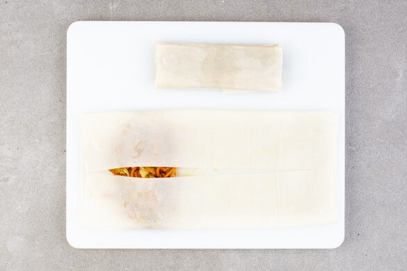 Den Teig ausrollen, jedes Blatt wird einzeln belegt. In einem breiten Streifen etwas Füllung auf 1 Blatt verteilen, seitlich ca. 1,5cm, oben und unten ca. 3cm Platz lassen. Den Teig von oben und unten über die Füllung klappen, dann seitlich einrollen. Es ist nicht schlimm, wenn der Teig dabei leicht zerreißt. Wiederholen, bis die Zutaten aufgebraucht sind.