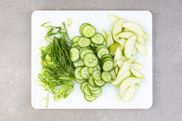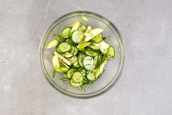 Die Lauchzwiebel schräg in dünne Ringe schneiden. Die 1/2 der Gurke in dünne Scheiben schneiden. Den Apfel vierteln, entkernen und ebenfalls in dünne Scheiben schneiden.