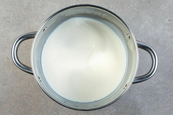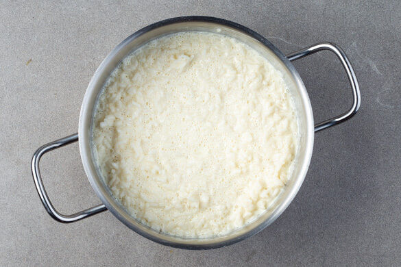 Die Milch mit 600ml Wasser in einem großen Topf zum Kochen bringen. Vorsicht, die Milch darf nicht überkochen oder anbrennen. Sobald sich kleine Bläschen bilden, die Milch nicht aus den Augen lassen.
