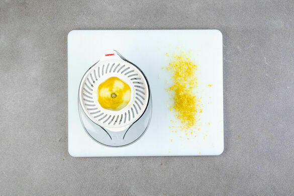 Inzwischen die Zitronenschale abreiben, dabei darauf achten, dass nichts vom weißen, bitteren Teil der Schale abgerieben wird. Die Zitronen halbieren und auspressen.